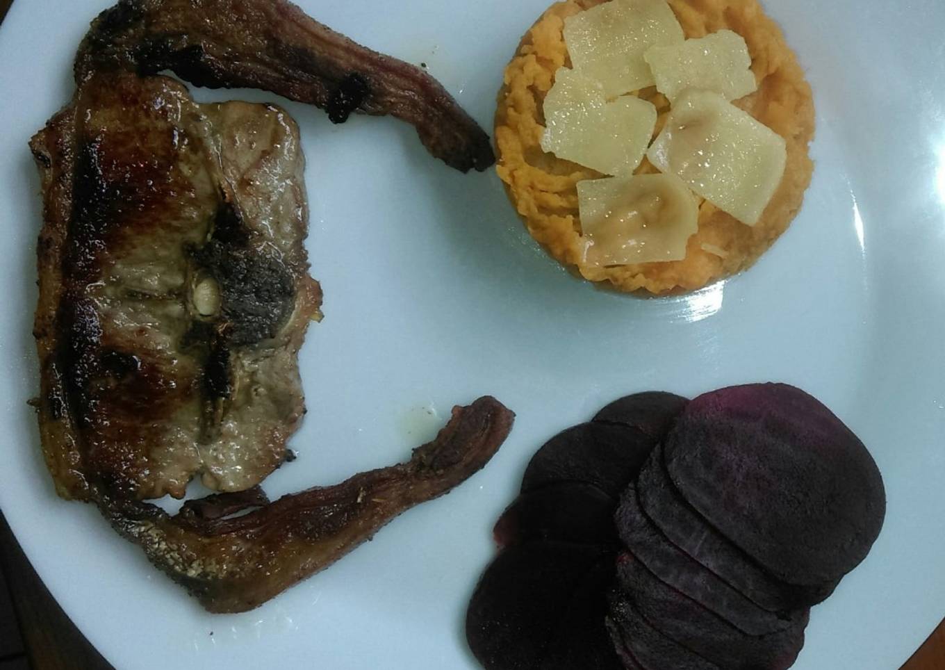 - En cada plato colocamos un aro de cocina y echamos dentro la mitad de la écrasé de batata y colocamos encima unas lascas de parmesano. Unas pocas de remolachas y una chuleta de cordero y listo nuestro plato para disfrutarlo.