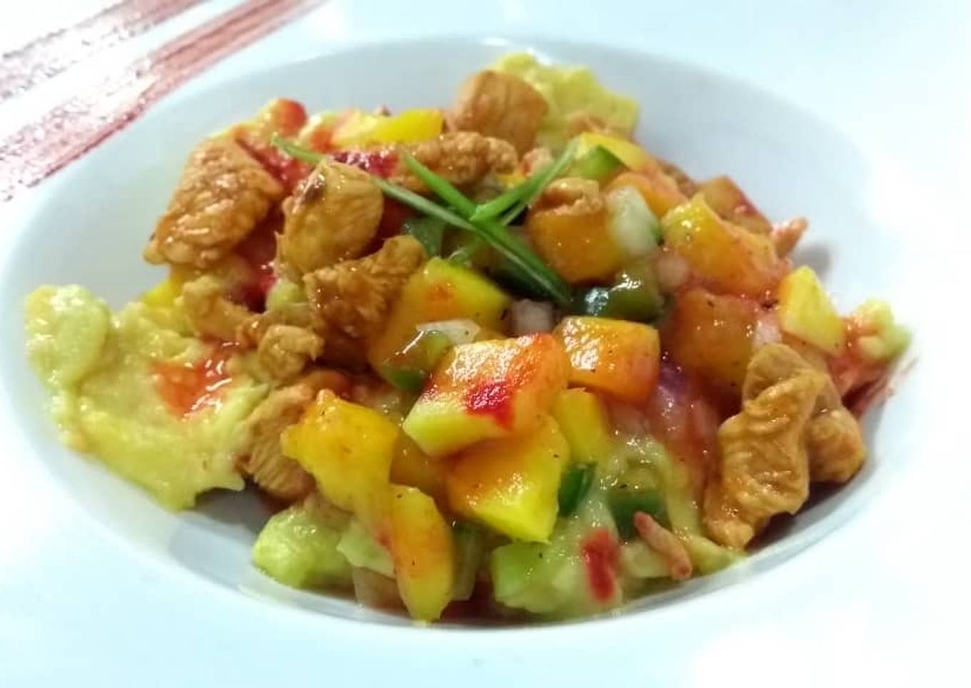 - Para emplatar: se hace un timbal como muestra la foto con 2 lonjas de pepino Unidos y se coloca la crema de aguacate, la mezcla que tenemos en el bol con mango, pimentón, pepino y cebolla, servirle la vinagreta y de último colocamos el pollo picante sal pimentar y degustar.