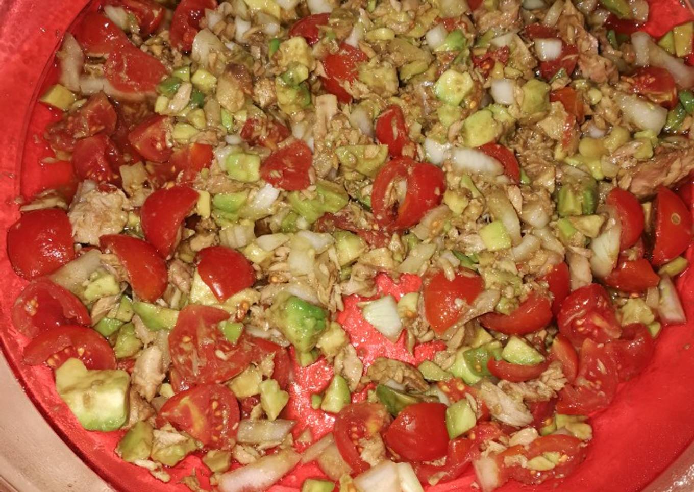 - Se pica el aguacate y los tomates cherrys. Si no tenéis cherrys con tomate en rama también se queda muy bien. Se añade a la fuente con la cebolla.