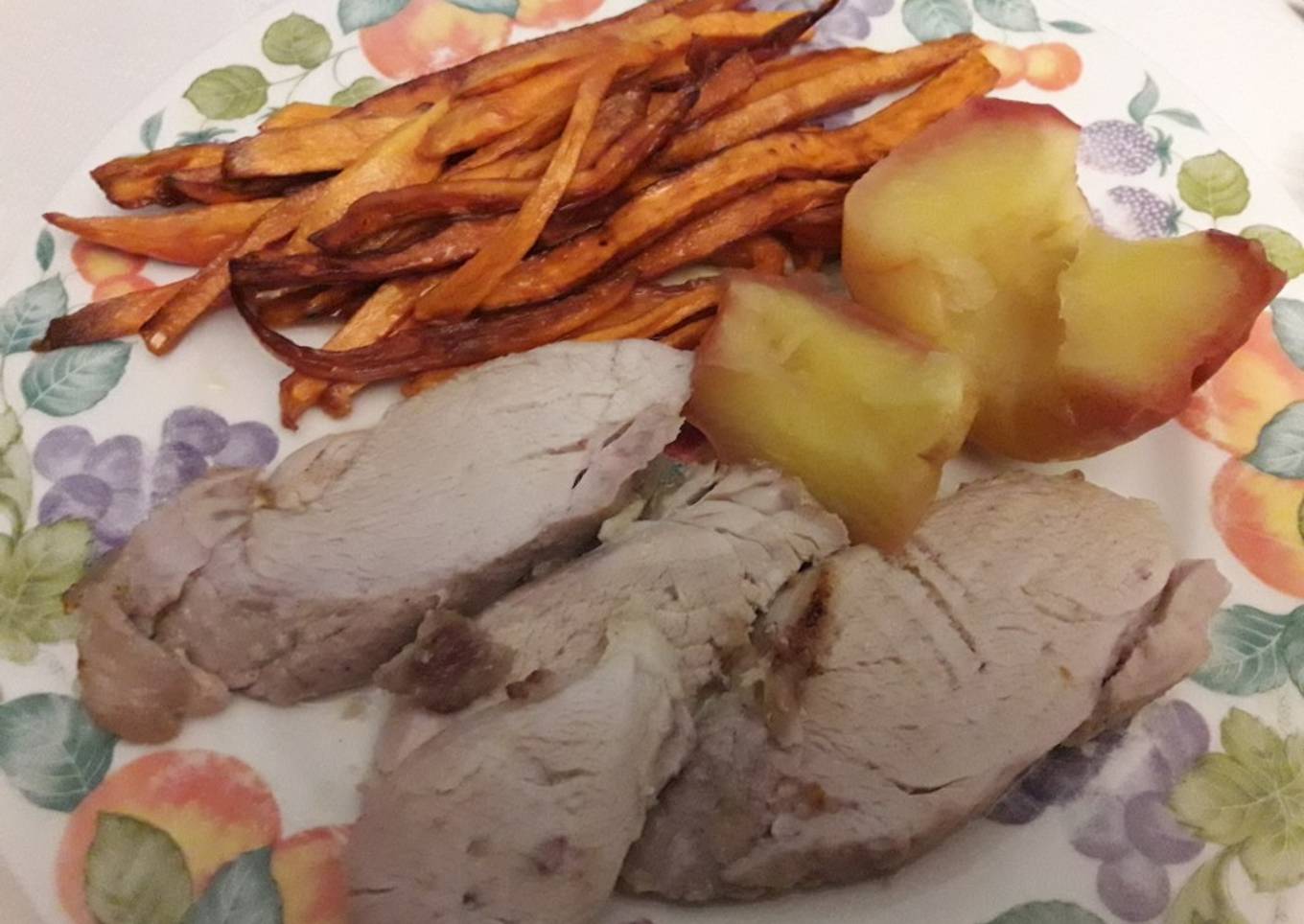 Solomillo de cerdo con manzanas asadas y chips de batata