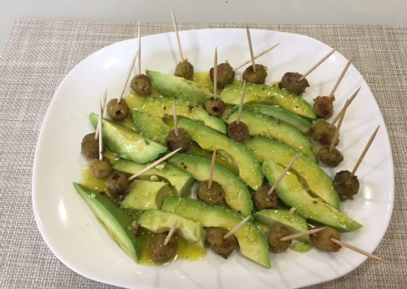 Aguacate con vinagreta a la mostaza y aceitunas rebozadas