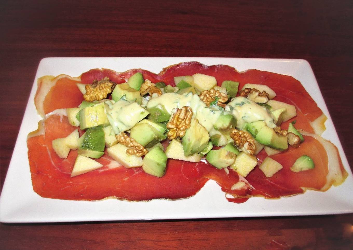 Ensalada de aguacate con jamón curado, nueces y manzana