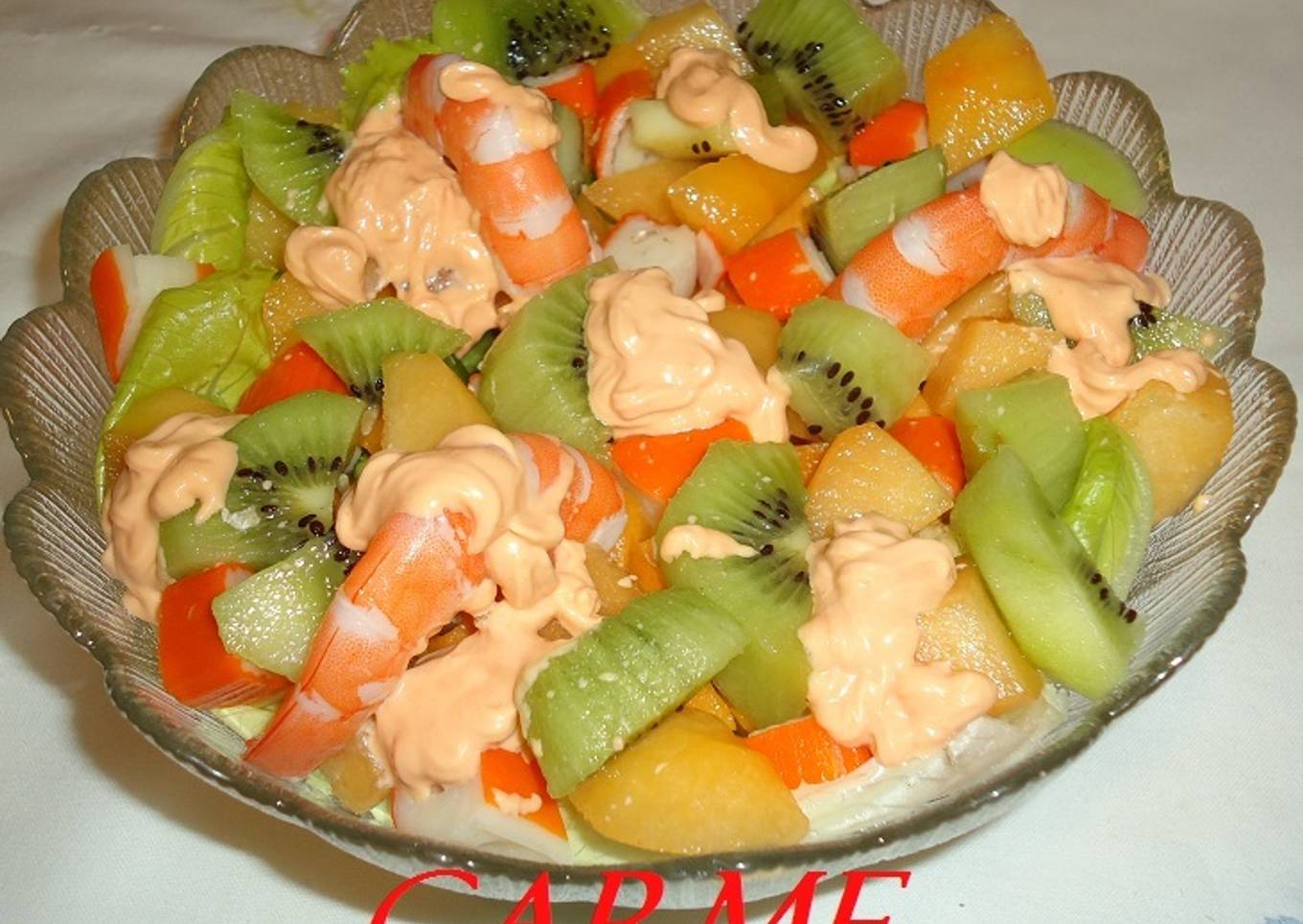 Ayer hice esta ensalada para mi cena y me gustó mucho, es muy refrescante a la vez que contiene muchas vitaminas. La hice para mí sola, pero se puede hacer la misma cantidad, para cuatro personas servida en copas, añadiendo algún langostinos más.