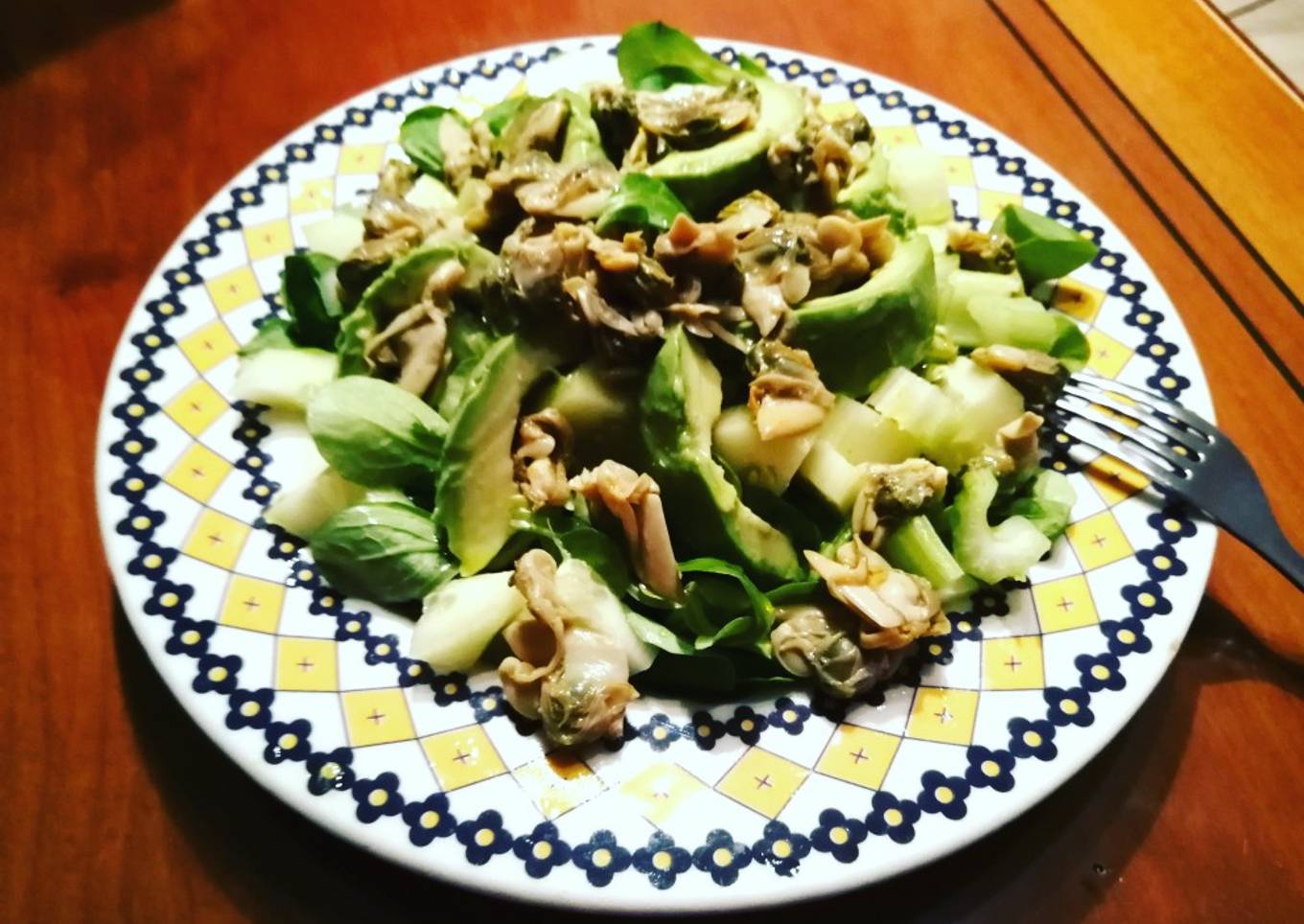 Ensalada de canónigos con berberechos, aguacate y pepino