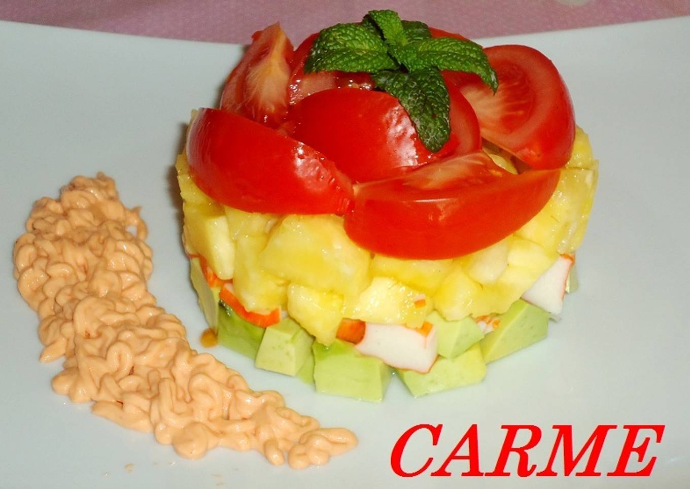 Riquisima receta de piña, aguacate, tomate y palitos de cangrejo. Acompañado de salsa rosa. Ideal para el buén tiempo.