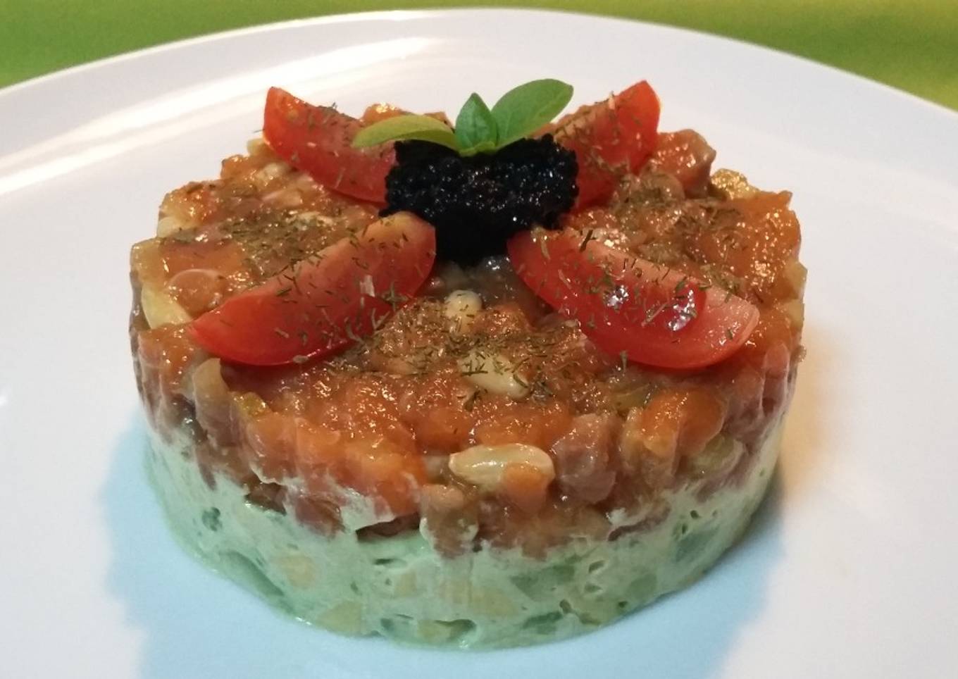 Un tartar de aguacate con crema de Torta del Casar, salmón marinado, piñones y caviar. Ideal para las fiestas, quedarás como un chef entre los comensales.