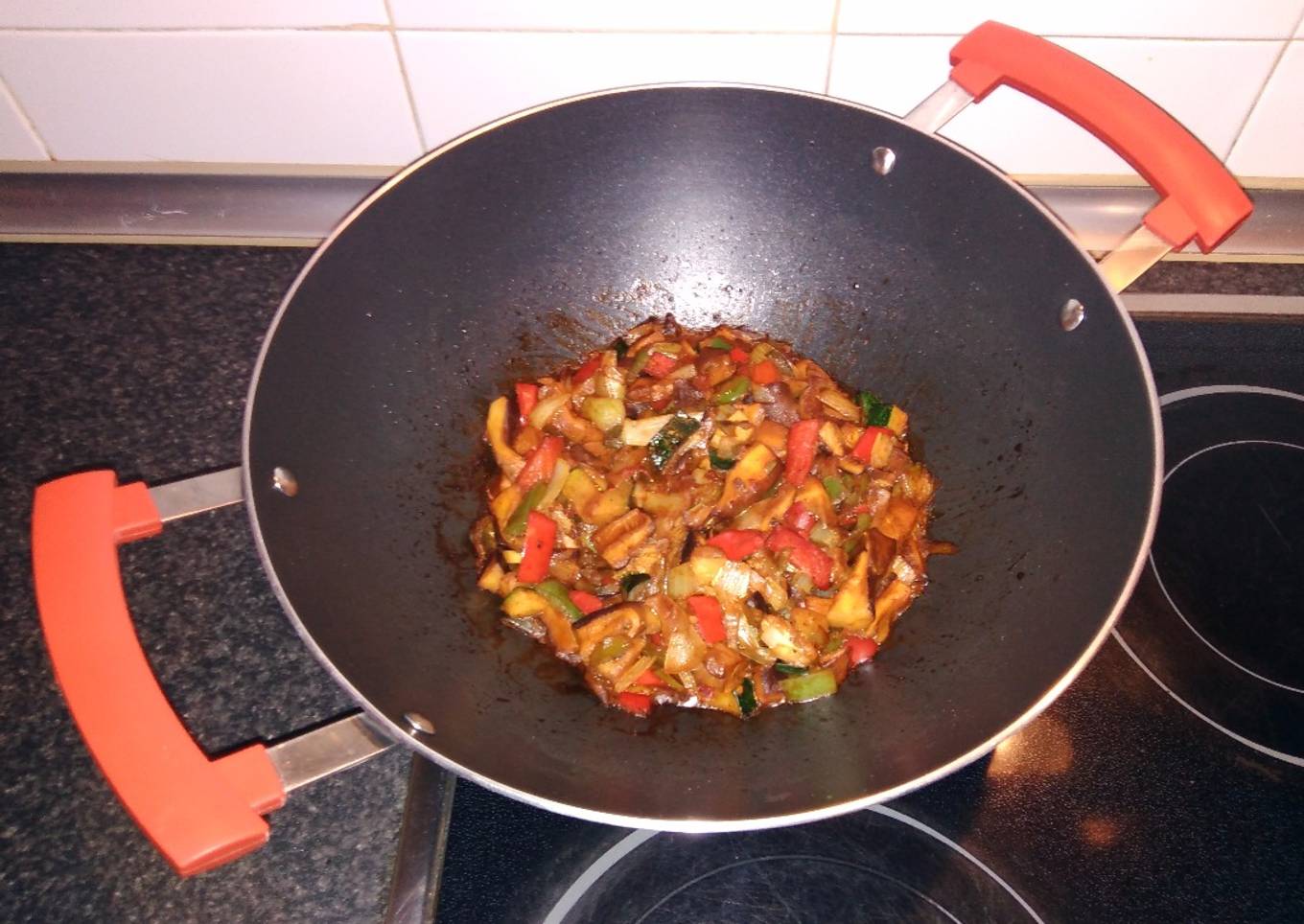 - Incorporamos las verduras, salpimentamos al gusto, añadimos una cucharadita de pimentón dulce o picante, un chorrito de salsa de soja y las salteamos con las setas apartando el wok del fuego cuando apenas quede líquido. Las verduras debieran quedar algo enteras.