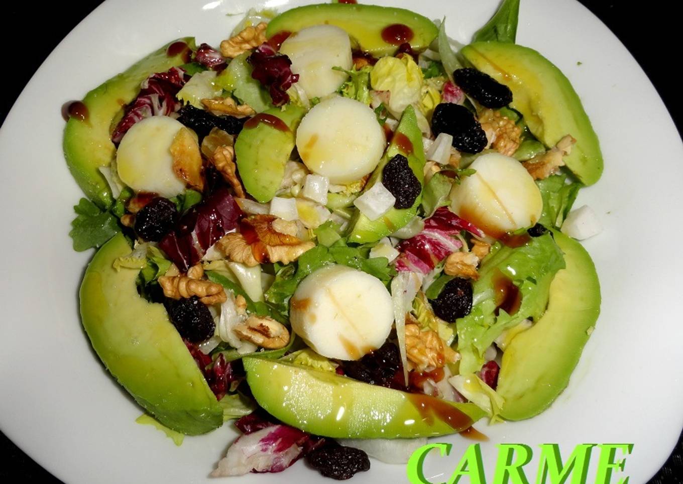 Esta ensalada es muy variada en sabores y texturas, ensalada fresca con nueces, pasas, coco deshidratado, plátano deshidratado, aguacate y medallones de palmitos. Aliñada con aceite de oliva virgen extra y reducción de vinagre Pedro Ximenez