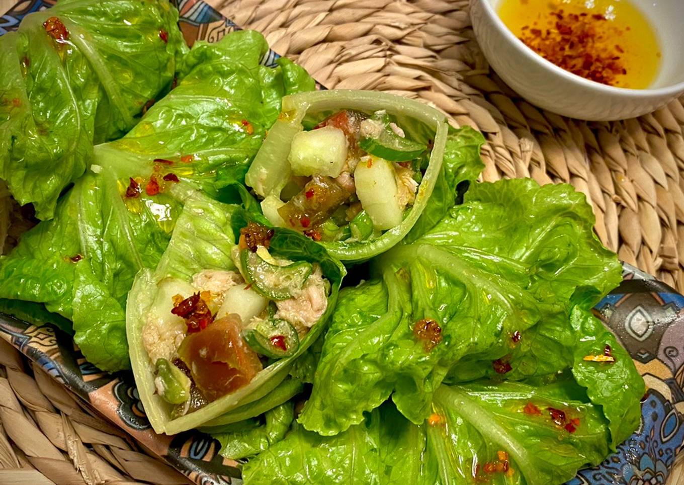 - Ponemos un poco de ensalada en el centro de cada hoja de lechuga y enrollamos con cuidado. Servimos con más aliño por encima.