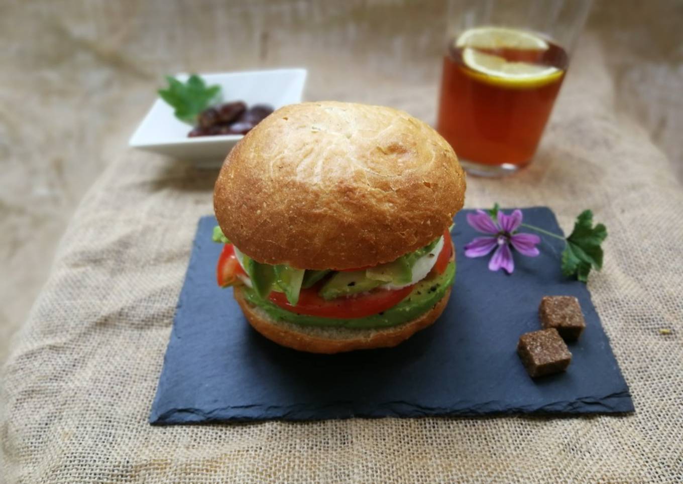 Para hoy prepare el pan Viena con queso de cabra, aguacate y tomate. Para acompañar unos dátiles hidratadas de la víspera y una taza de infunsión de rabanitos de cerezas.
