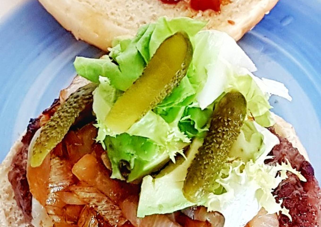 Una doble Cheeseburguer con cebolla caramelizada al curry, aguacate, brotes tiernos, y pepinillo