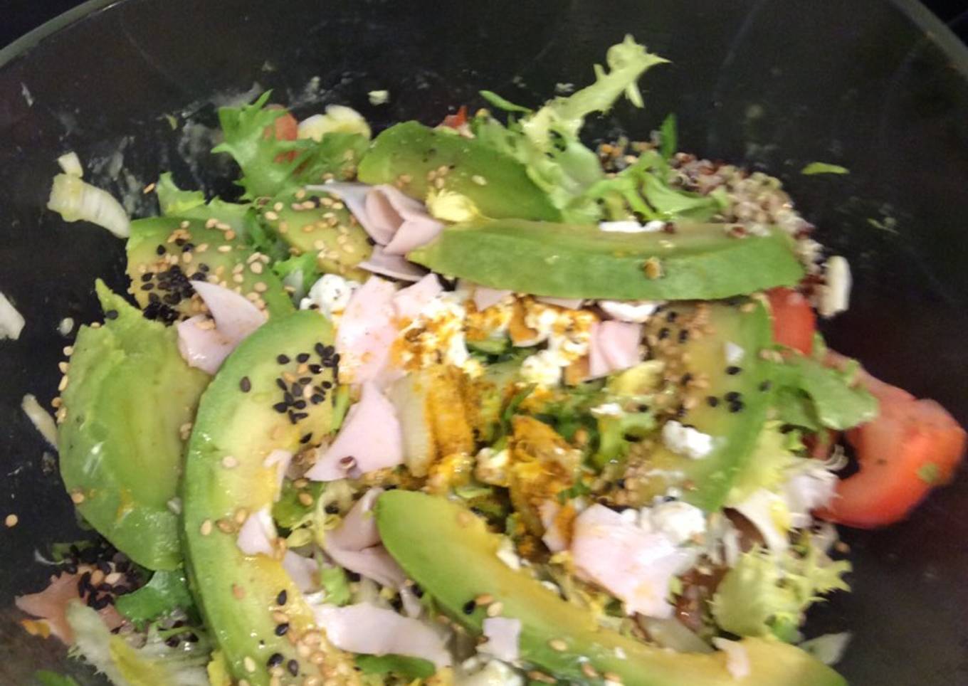 Adornamos con aguacate, queso granulado 0%, anacardos.