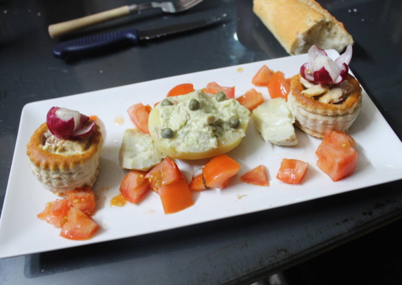 - Lavamos y troceamos a daditos el tomate, lo repartimos entre dos platos, lo sazonamos y añadimos a cada plato dos volovanes y media patata.